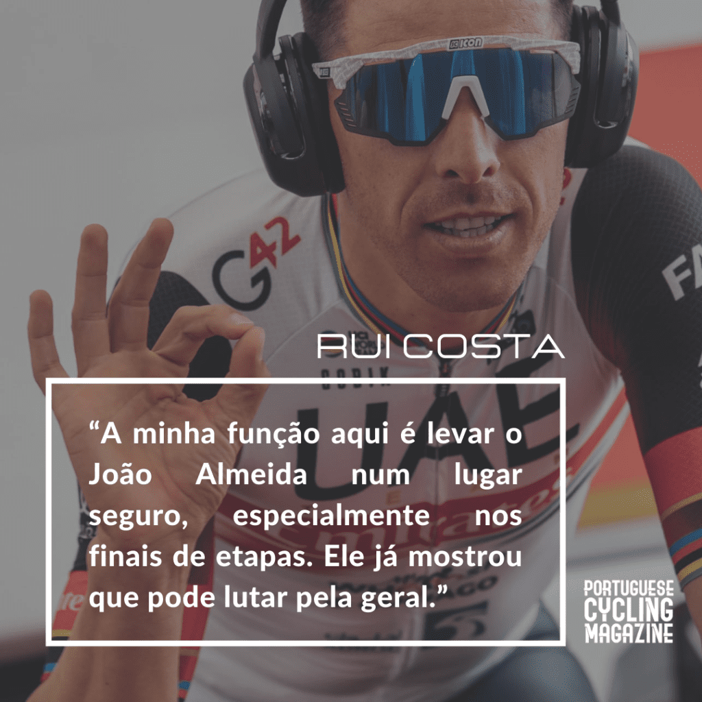 Numa importante missão de proteção tem sido normal vermos Rui Costa a ser o homem mais próximo de João Almeida “a minha função aqui é levar o João Almeida num lugar seguro, tanto ele como os meus colegas, especialmente nos finais de etapa. Ele é um grande atleta, pouco a pouco vai ganhando a experiência que um líder como ele precisa, mas ninguém nasce ensinado e estou cá para o que ele precisa”
