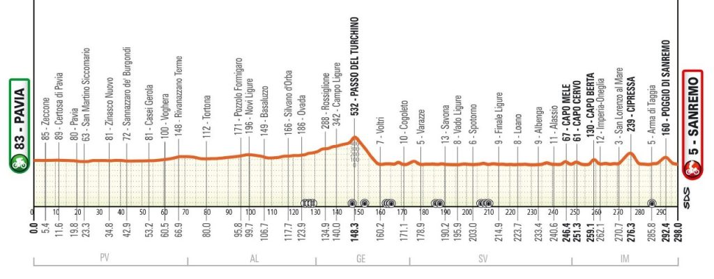 A 117.ª edição da “La Primavera” voltou a apresentar ao pelotão o seu icónico percurso de quase 300 quilómetros, com partida em Pavia e chegada à mítica Via Roma, em Sanremo. Como dita a tradição, as principais dificuldades orográficas seriam o Passo del Turchino (2,4 km’s a 5,2%), os três Capos – Mele, Cervo e Berta – e, já na fase decisiva, as emblemáticas subidas à Cipressa (5,7 km’s a 4,1%) e ao Poggio di Sanremo (3,7 km’s a 3,8%), sempre importantes para a definição do vencedor final.