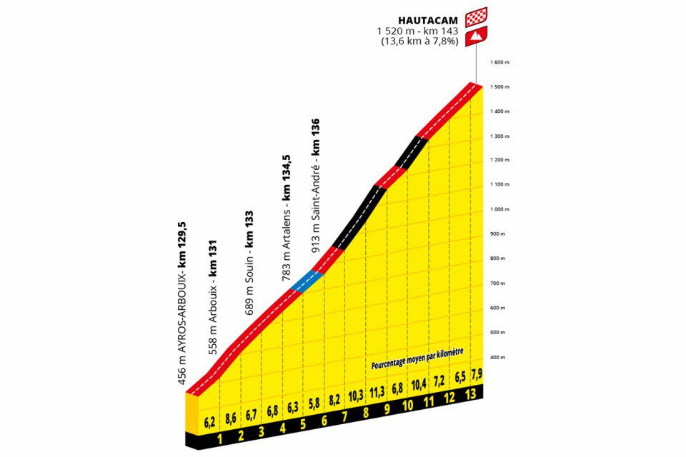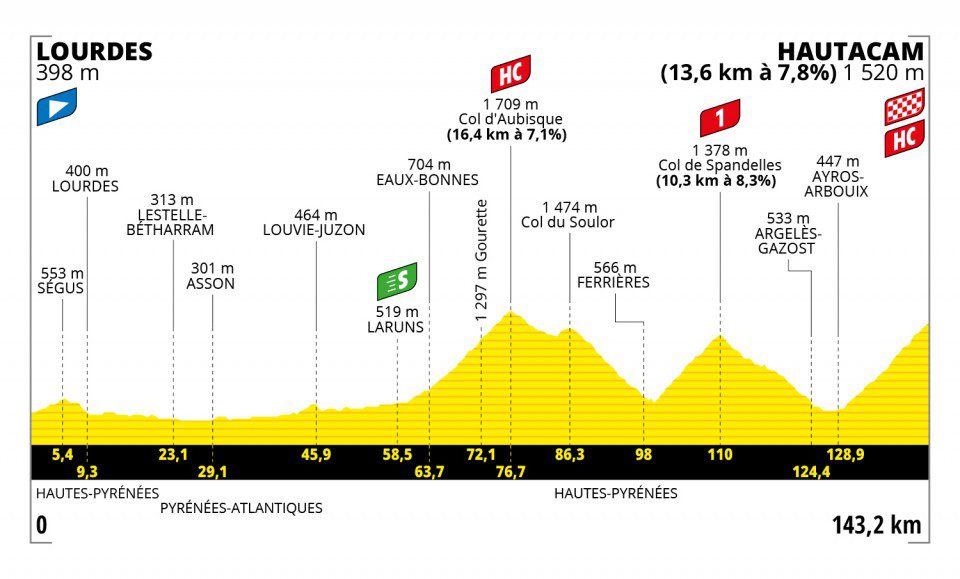 A primeira dificuldade do dia será logo o Col d’Aubisque, no entanto ao estar tão longe da meta será muito difícil os grandes favoritos começarem a mexer-se nessa contagem de montanha, no entanto poderá acontecer como no dia de ontem e a UAE Team Emirates começar logo a assumir a frente do pelotão com um ritmo demolidor que acabará por deixar muita gente em maus lençóis. De seguida teremos o Col de Spandelles que será a subida mais curta do dia e que pode ser o local do ataque de Tadej Pogačar, ele que hoje tentará mais uma vez levar a melhor sobre Jonas Vingegaard e terá de tentar o ataque de longe para surpreender o dinamarquês. A etapa acaba com o Hautacam que terá a sua parte dura na segunda parte da subida e poderá fazer mossa nas contas finais.